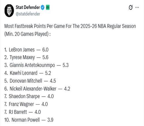 41岁又如何詹姆斯场均快攻得分领跑NBA马克西第二字母哥第三