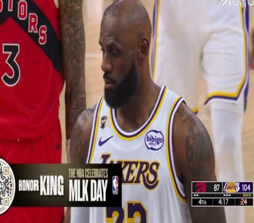 湖人VS猛龙第四节,詹姆斯隔扣造成犯规走上罚球线,主场球迷喊起MVP的呼声。