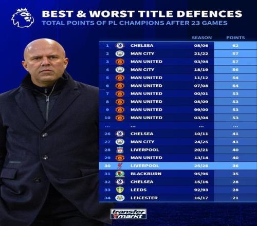 德国转会市场网站列出了英超历史上卫冕冠军在赛季前23场比赛过后的积分排行,本赛季的利物浦以36分排名倒数第五。